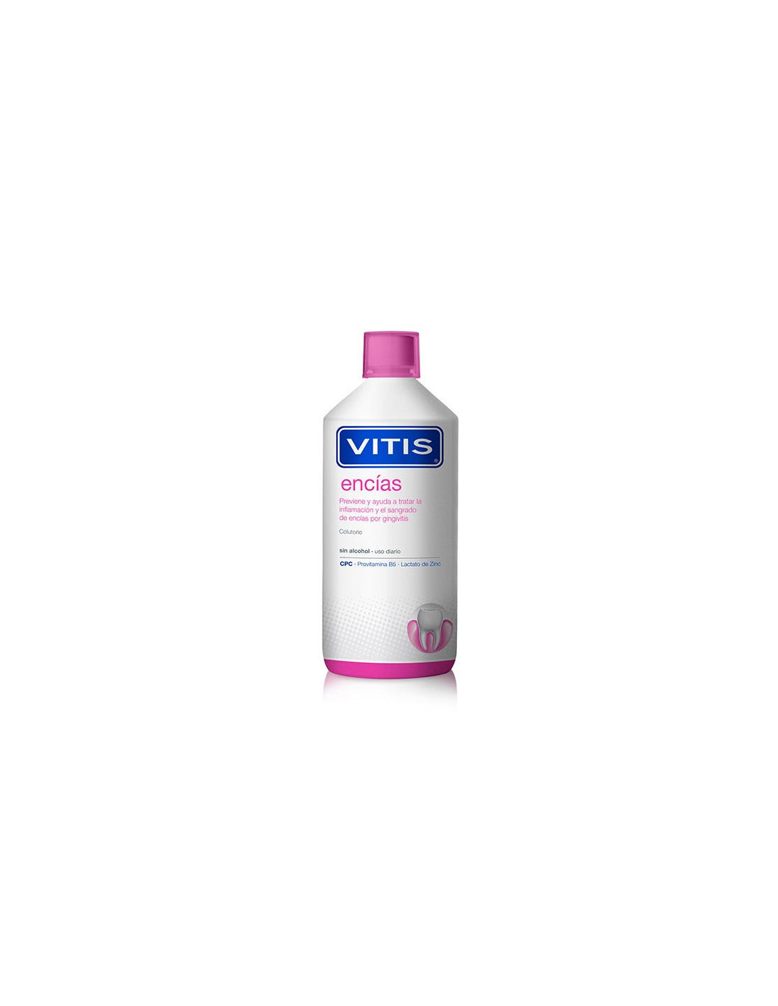 El colutorio VITIS® encías es un enjuague bucal específicamente formulado para controlar la gingivitis. Su uso continuado ayuda a prevenir la inflamación y el sangrado de las encías. Además, inhibe la formación de biofilm oral (placa bacteriana) y reduce su acumulación en la cavidad bucal, previniendo así la aparición o el desarrollo de gingivitis.